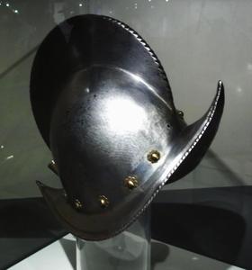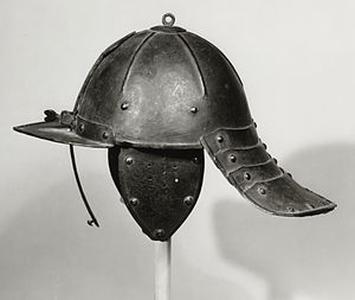 Casque appelé aussi "pot d'arquebusier", en usage dans la cavalerie à l'époque de la guerre de Trente Ans et de la guerre civile anglaise. Il a une barre nasale coulissante, et un long protège-cou fait de lames striées, qui justifie son surnom.