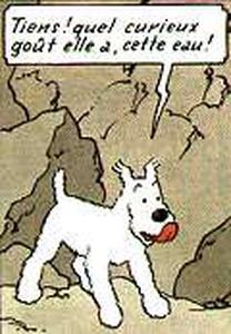 Chien se tenant debout qui s'exprime essentiellement par "Glop-glop !" et "Pas glop, pas glop !".