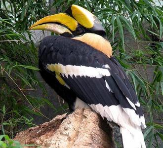 De la famille des Bucérotidés, ce grand oiseau au plumage noir et blanc est reconnaissable au casque qui orne le dessus de son bec et qui lui sert de caisse de résonance.