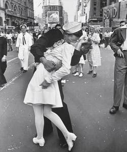 Photo prise à New York le jour de la capitulation du Japon. Elle montre un marin de l’US Navy penché sur une jeune infirmière qu'il est en train d'embrasser.