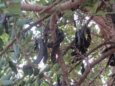 Cet arbre, du genre Ceratonia, produit des gousses brun foncé qui rappellent celles du haricot. Ces gousses peuvent être consommées fraîches mais aussi grillées.