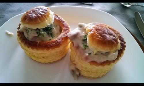 Charcuterie pâtissière salée, composée de pâte feuilletée et garnie de préparations très variées appelées "appareil". Elle est couramment en forme de petit pain roulé et fourré d'un hachis mixte.